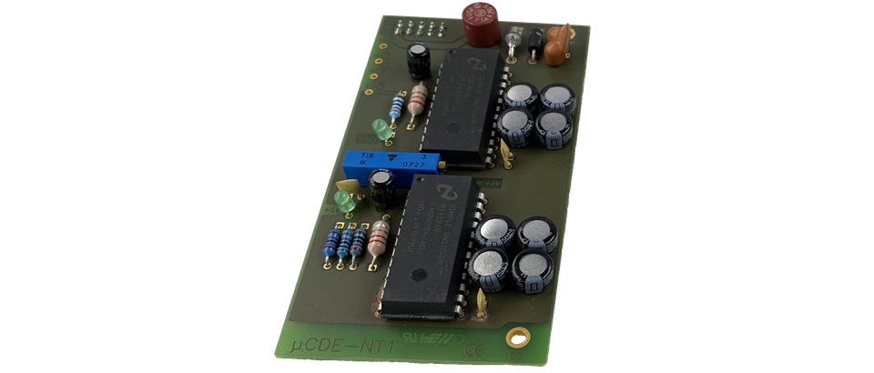Option NT1 für das Einplatinenfarb-DE µCDE. Die NT1 wird links auf die Baugruppe µCDE gesteckt. Jetzt kann die gesamte Einheit mit einer unstabilisierten Gleichspannung von 15...30V= versorgt werden. Die NT1 arbeitet effizient mit Schaltnetzteilen und ist kurzschluß- und übertemperaturfest.