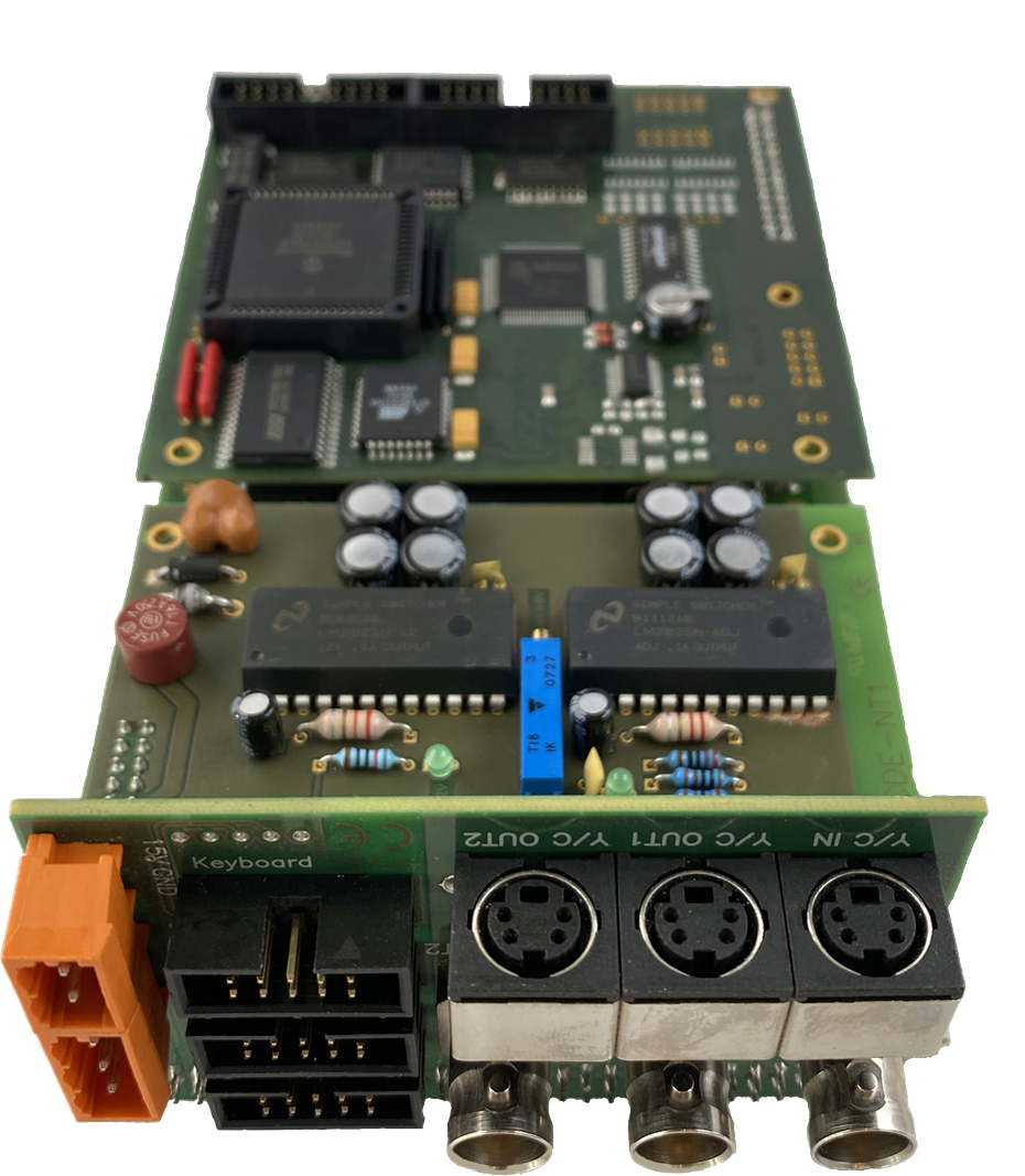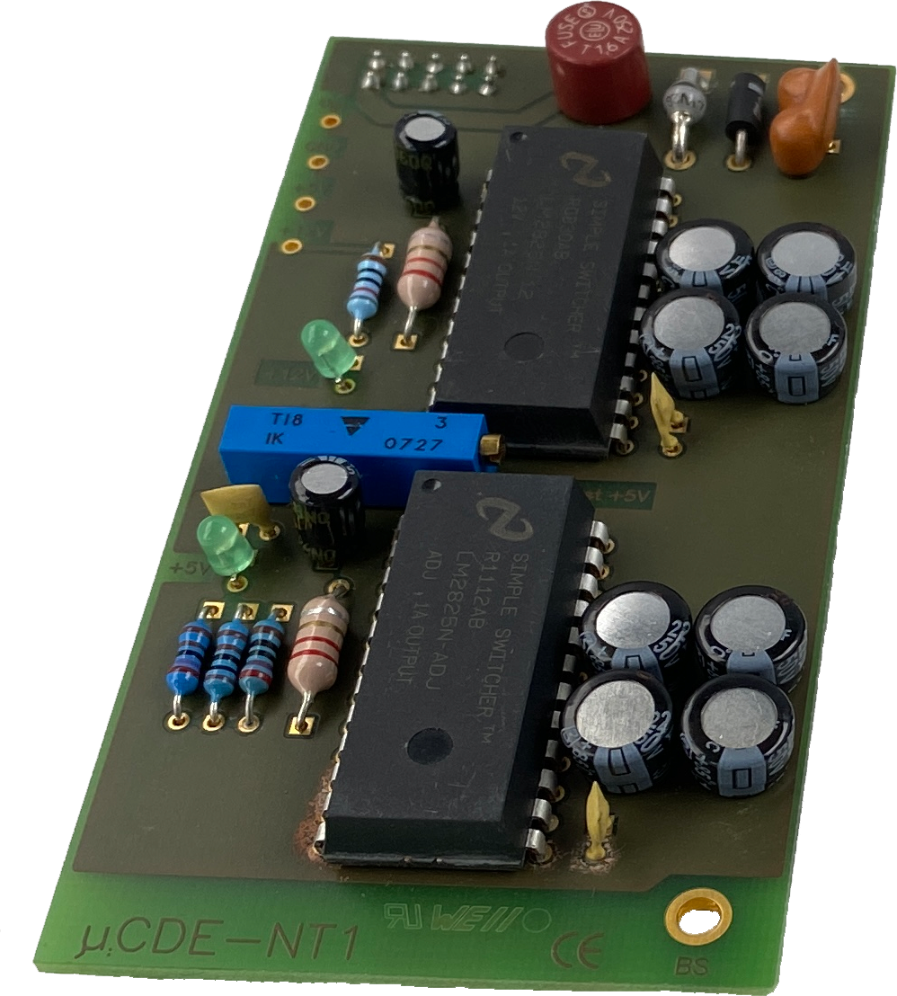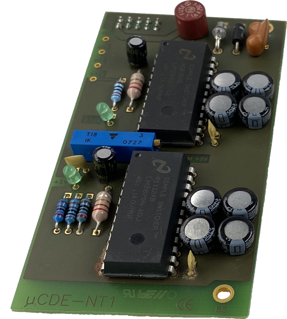 Option NT1 für das Einplatinenfarb-DE µCDE. Die NT1 wird links auf die Baugruppe µCDE gesteckt. Jetzt kann die gesamte Einheit mit einer unstabilisierten Gleichspannung von 15...30V= versorgt werden. Die NT1 arbeitet effizient mit Schaltnetzteilen und ist kurzschluß- und übertemperaturfest.