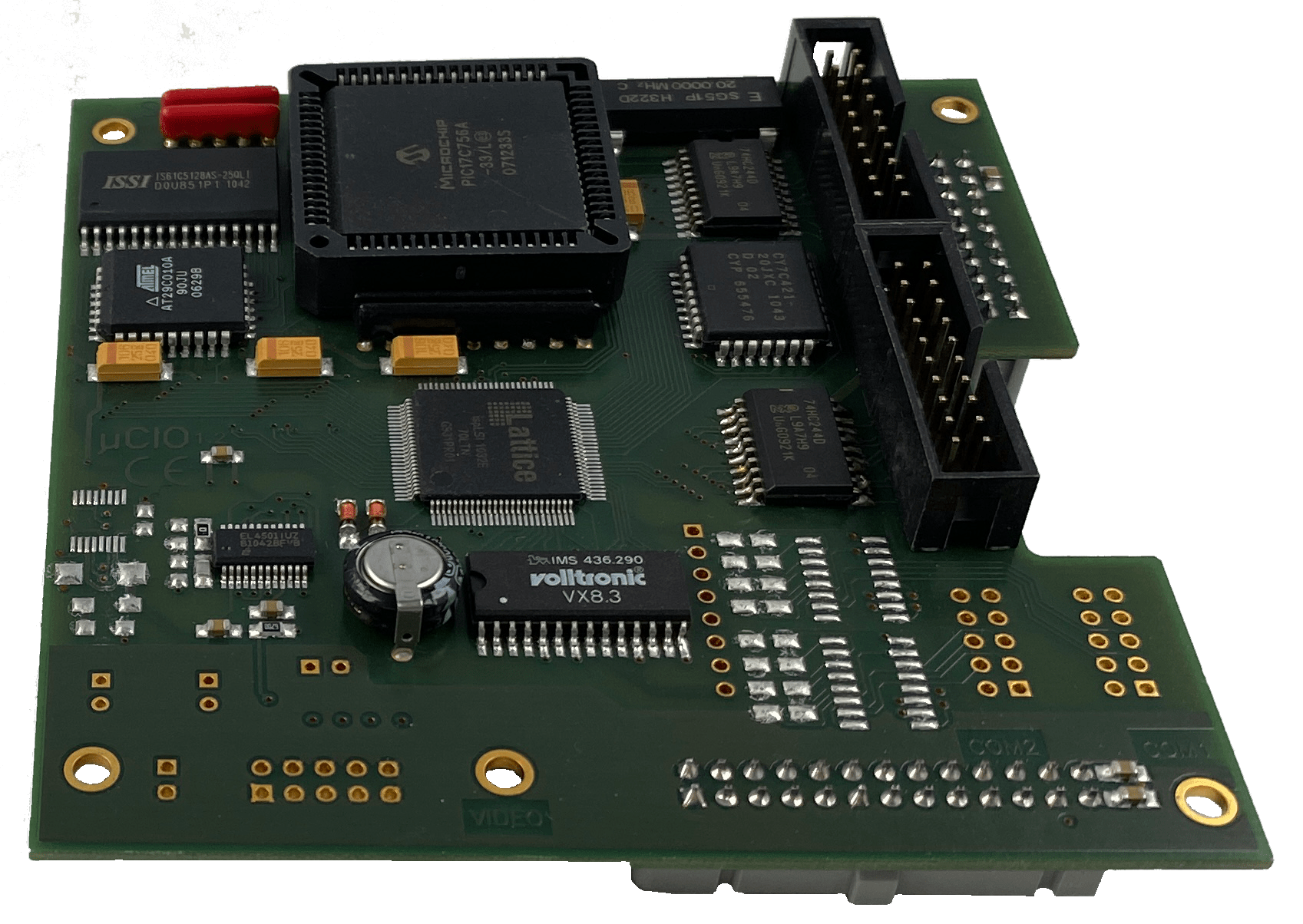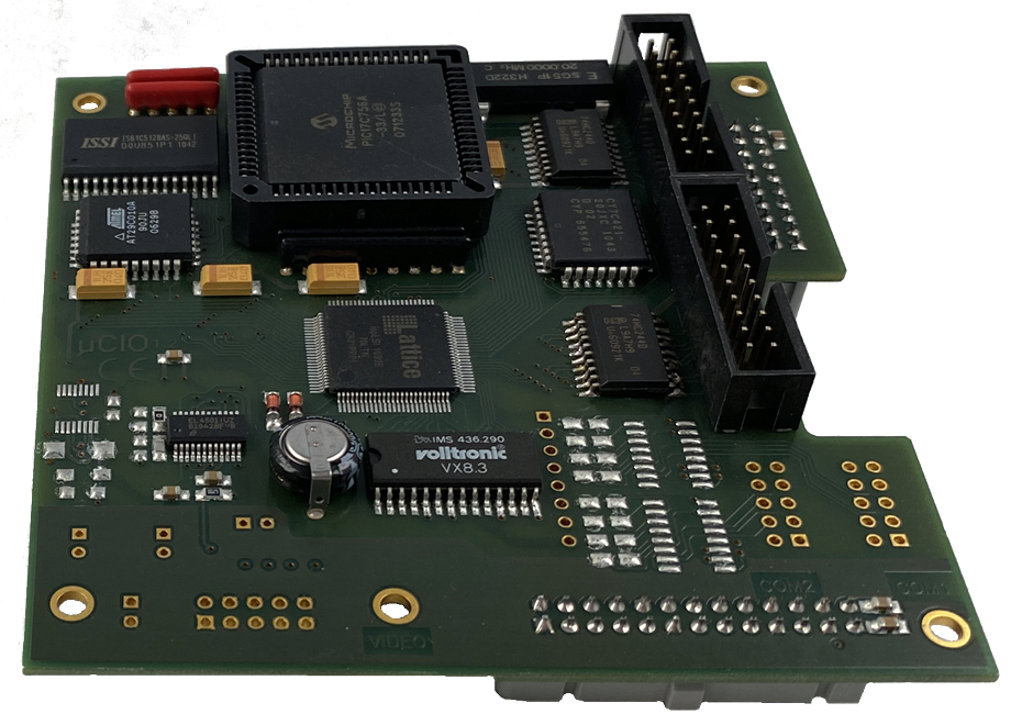Die Option µCIO für das Einplatinenfarb-DE µCDE wird rechts auf die Baugruppe µCDE gesteckt. Es ist eine universelle I/O-Baugruppe und erweitert die DE µCDE um zwei Schnittstellen RS-232, einen weiteren autonomen Meterzähler, einen NV-Speicher für Meßwerte (Neigungsprofil), einen Video-Multiplexer (Satellit), einen Video-Buffer, einen Video-Daten-Empfänger und digitale I/O. Mit einer speziellen Software wird diese Baugruppe optimal an die TV-Anlage adaptiert.