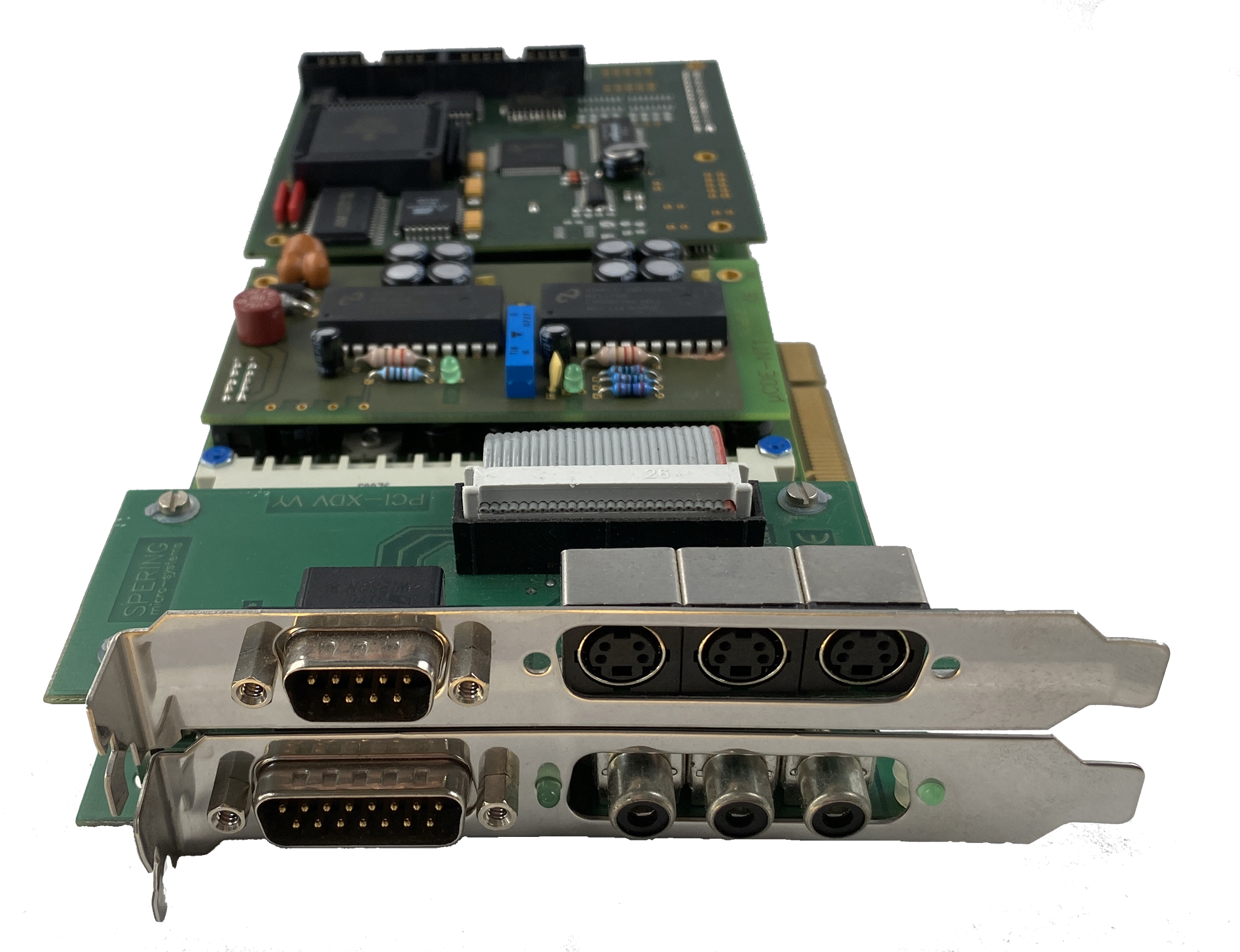 Mit der Option PCI wird das Einplatinen-Farb-DE µCDE zu einer kompakten Steckbaugruppe für Computer mit PCI-Slots. Hierbei erfolgt über den PCI-Bus lediglich die Versorgng der DE, alle Schnittstellen, der Inkremental-Enkoder-Eingang und Video In/Out stehen an den Slotblechen zur Verfügung. Die Baugruppe belegt zwei Steckplätze.