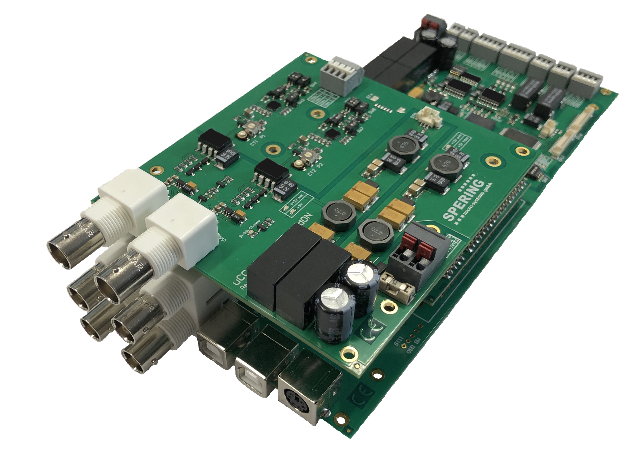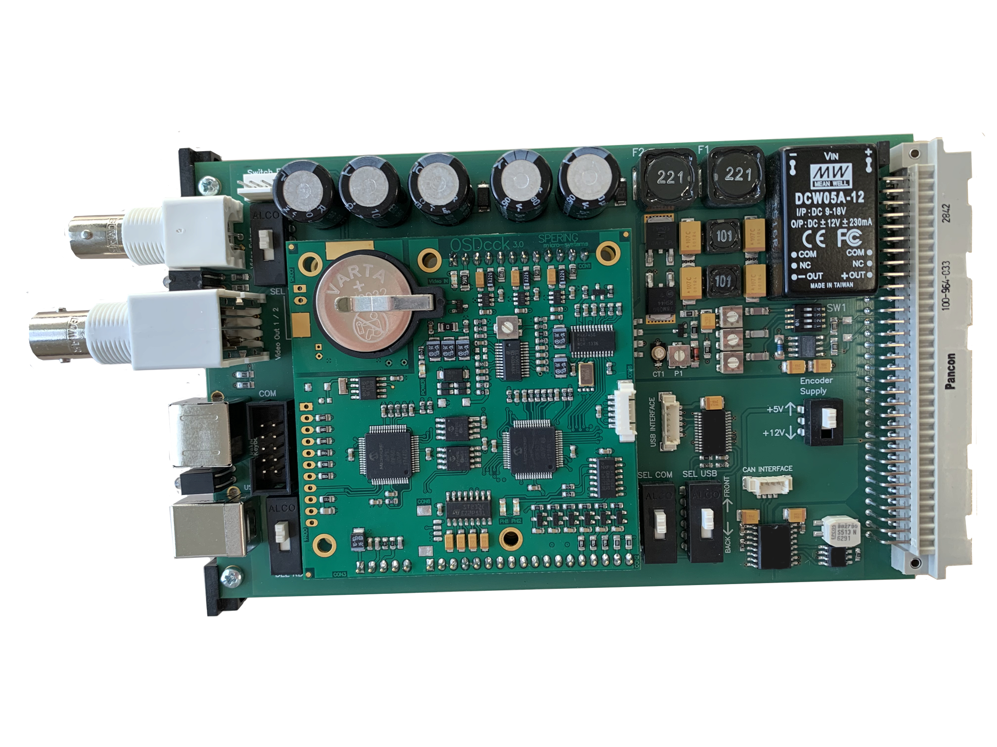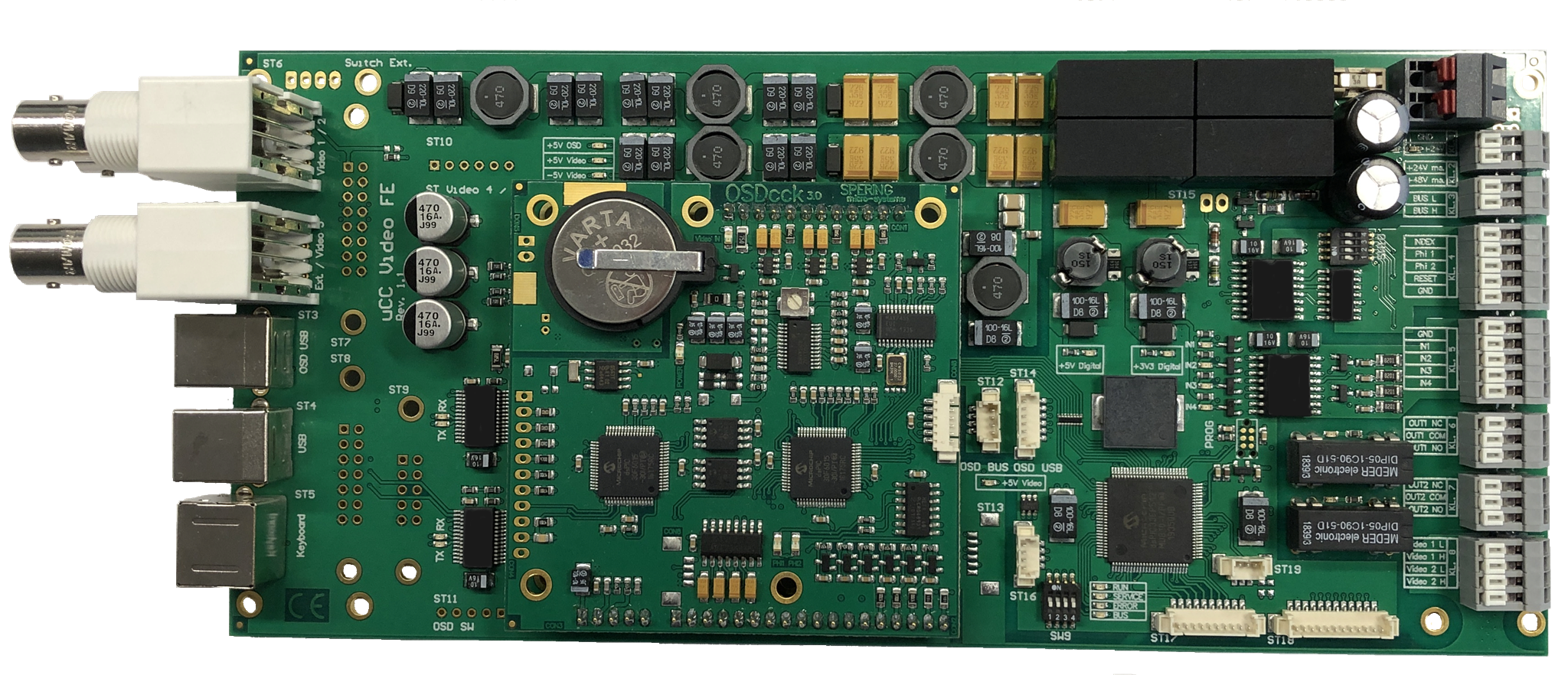 VideoCtrl ist eine FrontEnd-Baugruppe im Europakartenformat für 19"-Gehäuse und hochwertige Steuergeräte. Die Abbildung zeigt die Baugruppe mit der Dateneinblendung OSDcck.